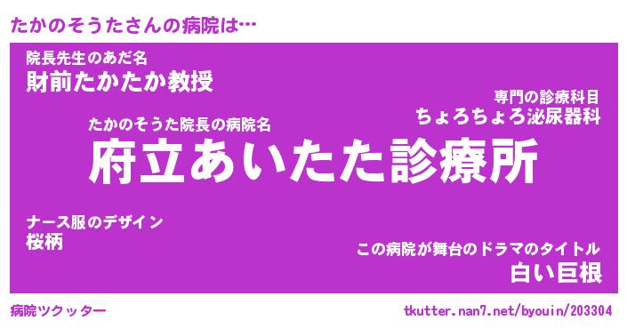 たかのそうたさんの病院は… たかのそうた院長の病院名『府立あいたた診療所』院長先生のあだ名『財前たかたか教授』この病院が舞台のドラマのタイトル『白い巨根』 ツクッター #病院ツクッター http://tkutter.nan7.net/byouin/203304/