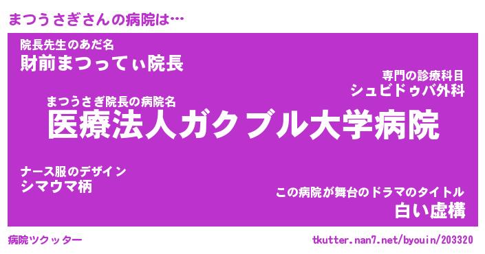 まつうさぎさんの病院は… まつうさぎ院長の病院名『医療法人ガクブル大学病院』院長先生のあだ名『財前まつってぃ院長』この病院が舞台のドラマのタイトル『白い虚構』 ツクッター #病院ツクッター http://tkutter.nan7.net/byouin/203320/