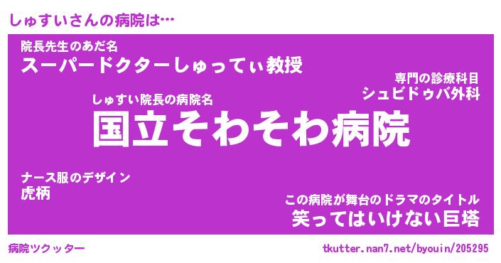 | 男性向けラノベタイトル風あだ名 | 『しゅすいの憂鬱』 |