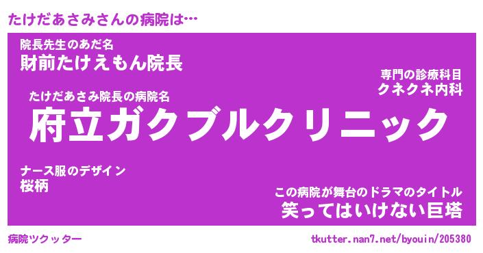 | ヘコむあだ名 | 『たけにゅー』『酢こんぶ』『たけお』 |