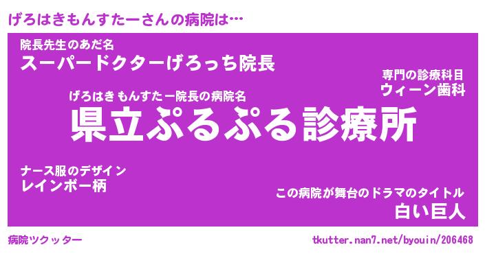| 男性向けラノベタイトル風あだ名 | 『げろはきもんすたーの憂鬱』 |