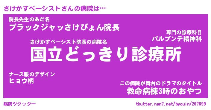 さけかすベーシストさんの病院は… さけかすベーシスト院長の病院名『国立どっきり診療所』院長先生のあだ名『ブラックジャッさけぴょん院長』この病院が舞台のドラマのタイトル『救命病棟3時のおやつ』 ツクッター #病院ツクッター http://tkutter.nan7.net/byouin/207699/