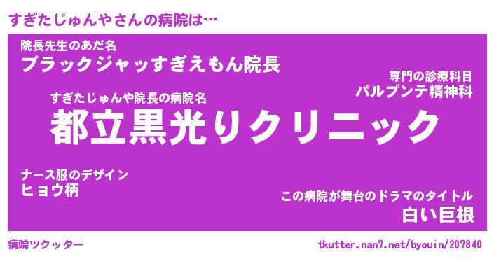 すぎたじゅんやさんの病院は… すぎたじゅんや院長の病院名『都立黒光りクリニック』院長先生のあだ名『ブラックジャッすぎえもん院長』この病院が舞台のドラマのタイトル『白い巨根』 ツクッター #病院ツクッター http://tkutter.nan7.net/byouin/207840/