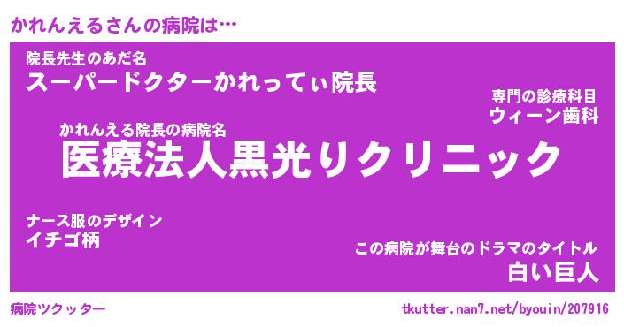 かれんえるさんの病院は… かれんえる院長の病院名『医療法人黒光りクリニック』院長先生のあだ名『スーパードクターかれってぃ院長』この病院が舞台のドラマのタイトル『白い巨人』 ツクッター #病院ツクッター http://tkutter.nan7.net/byouin/207916/