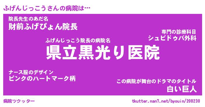ふげんじっこうさんの病院は… ふげんじっこう院長の病院名『県立黒光り医院』院長先生のあだ名『財前ふげぴょん院長』この病院が舞台のドラマのタイトル『白い巨人』 ツクッター #病院ツクッター http://tkutter.nan7.net/byouin/208230/
