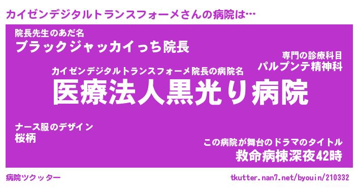 | 男性向けラノベタイトル風あだ名 | 『カイゼンデジタルトランスフォーメアートオンライン』 |