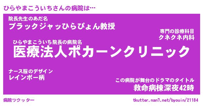 ひらやまこういちさんの病院は… ひらやまこういち院長の病院名『医療法人ポカーンクリニック』院長先生のあだ名『ブラックジャッひらぴょん教授』この病院が舞台のドラマのタイトル『救命病棟深夜42時』 ツクッター #病院ツクッター http://tkutter.nan7.net/byouin/21184/
