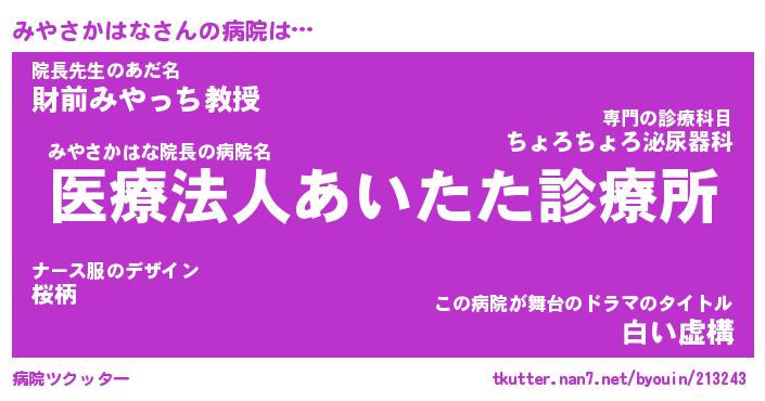 | ヒーロー風カッコイイあだ名 | 『スーパーミヤサカハナ』『炎刃騎士ミヤ』 |
