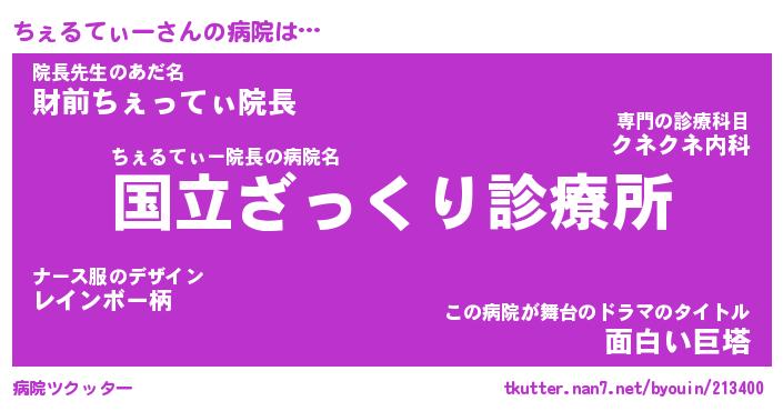 | 男性向けラノベタイトル風あだ名 | 『ちぇるてぃーの憂鬱』 |