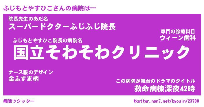 ふじもとやすひこさんの病院は… ふじもとやすひこ院長の病院名『国立そわそわクリニック』院長先生のあだ名『スーパードクターふじふじ院長』この病院が舞台のドラマのタイトル『救命病棟深夜42時』 ツクッター #病院ツクッター http://tkutter.nan7.net/byouin/23700/