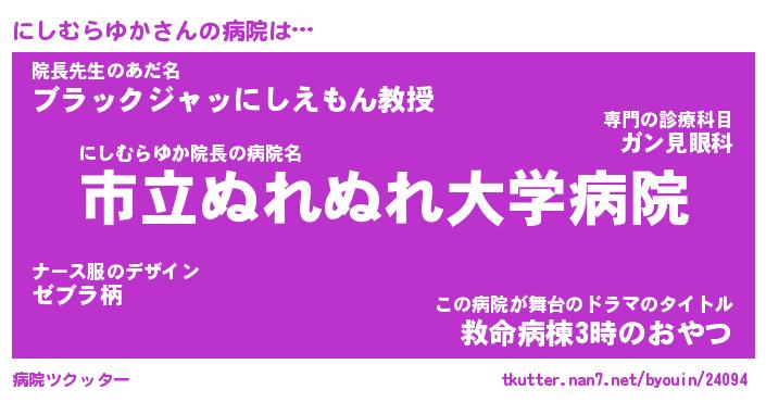 | ヒーロー風カッコイイあだ名 | 『スーパーニシムラユカ』『魔戒騎士ニシ』 |