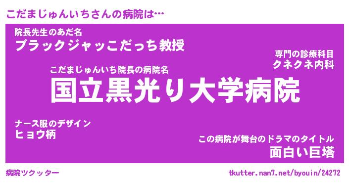 こだまじゅんいちさんの病院は… こだまじゅんいち院長の病院名『国立黒光り大学病院』院長先生のあだ名『ブラックジャッこだっち教授』この病院が舞台のドラマのタイトル『面白い巨塔』 ツクッター #病院ツクッター http://tkutter.nan7.net/byouin/24272/