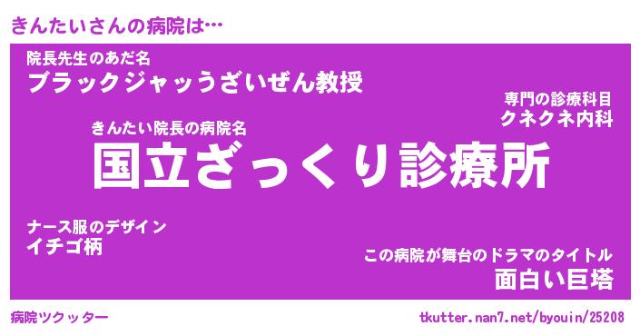 きんたいさんの病院は… きんたい院長の病院名『国立ざっくり診療所』院長先生のあだ名『ブラックジャッうざいぜん教授』この病院が舞台のドラマのタイトル『面白い巨塔』 ツクッター #病院ツクッター http://tkutter.nan7.net/byouin/25208/