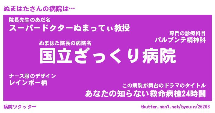 | 女子向けラノベタイトル風あだ名 | 『(仮)ぬまはたのやんごとなき事情』 |