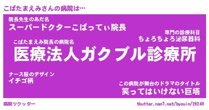 | 肩書あだ名 | 『こばたまえみ店長』『こばたまえみ校長』 |