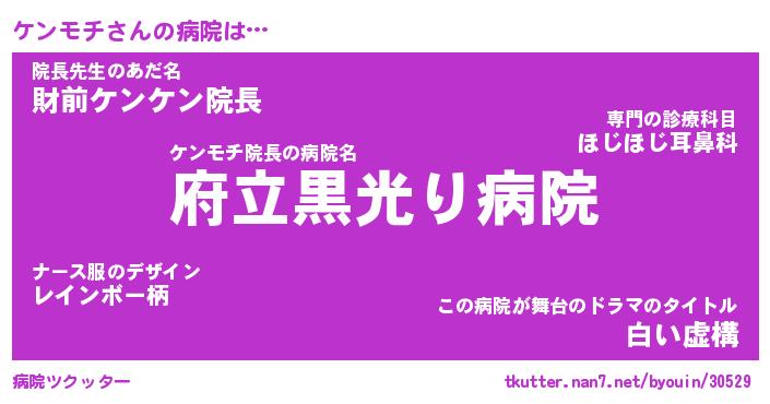 ケンモチさんの病院は… ケンモチ院長の病院名『府立黒光り病院』院長先生のあだ名『財前ケンケン院長』この病院が舞台のドラマのタイトル『白い虚構』 ツクッター #病院ツクッター http://tkutter.nan7.net/byouin/30529/
