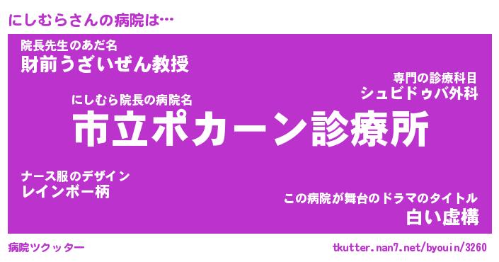| 男性向けラノベタイトル風あだ名 | 『にしむらの憂鬱』 |