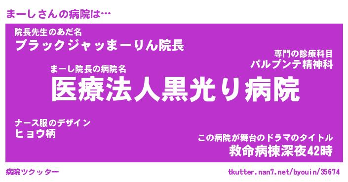 まーしさんの病院は… まーし院長の病院名『医療法人黒光り病院』院長先生のあだ名『ブラックジャッまーりん院長』この病院が舞台のドラマのタイトル『救命病棟深夜42時』 ツクッター #病院ツクッター http://tkutter.nan7.net/byouin/35674/
