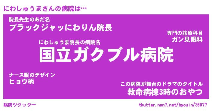 | 男性向けラノベタイトル風あだ名 | 『にわしゅうまの憂鬱』 |