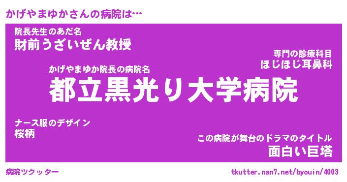 かげやまゆかさんの病院は… かげやまゆか院長の病院名『都立黒光り大学病院』院長先生のあだ名『財前うざいぜん教授』この病院が舞台のドラマのタイトル『面白い巨塔』 ツクッター #病院ツクッター http://tkutter.nan7.net/byouin/4003/