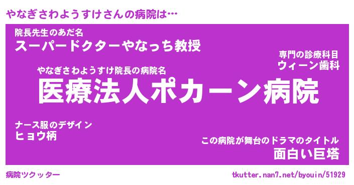 やなぎさわようすけさんの病院は… やなぎさわようすけ院長の病院名『医療法人ポカーン病院』院長先生のあだ名『スーパードクターやなっち教授』この病院が舞台のドラマのタイトル『面白い巨塔』 ツクッター #病院ツクッター http://tkutter.nan7.net/byouin/51929/