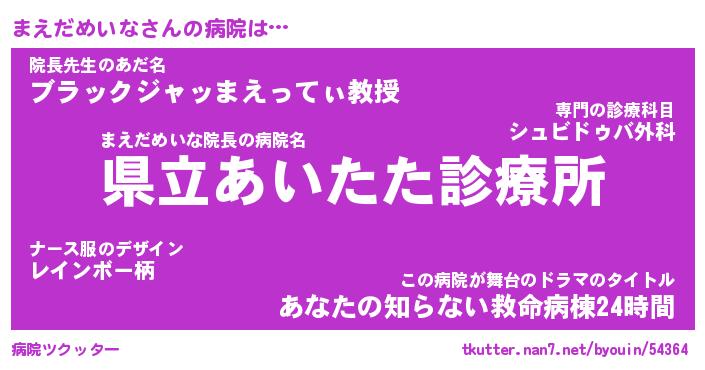 まえだめいなさんの病院は… まえだめいな院長の病院名『県立あいたた診療所』院長先生のあだ名『ブラックジャッまえってぃ教授』この病院が舞台のドラマのタイトル『あなたの知らない救命病棟24時間』 ツクッター #病院ツクッター http://tkutter.nan7.net/byouin/54364/