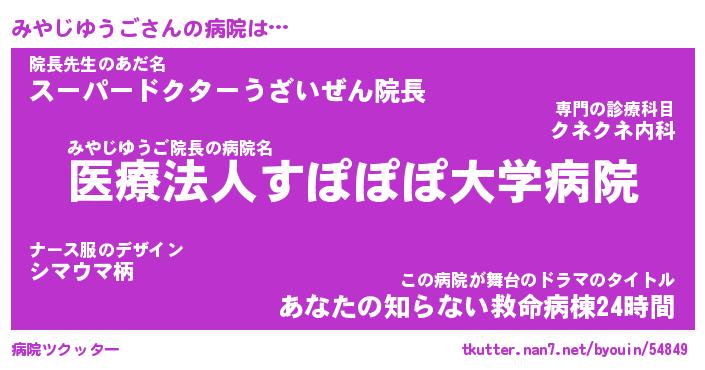 | ヒーロー風カッコイイあだ名 | 『スーパーミヤジユウゴ』『天弓騎士ミヤ』 |