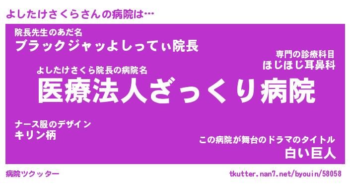 | 伝説のあだ名 | 『封印されしスナイパーよしたけさくら』 |