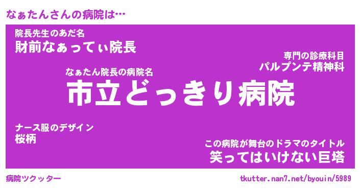 なぁたんさんの病院は… なぁたん院長の病院名『市立どっきり病院』院長先生のあだ名『財前なぁってぃ院長』この病院が舞台のドラマのタイトル『笑ってはいけない巨塔』 ツクッター #病院ツクッター http://tkutter.nan7.net/byouin/5989/