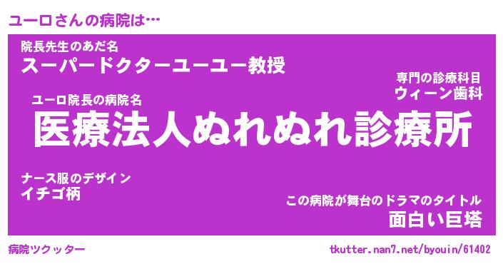 | ポケモン風あだ名 | 『ユーチュウ』『ユーロダネ』 |