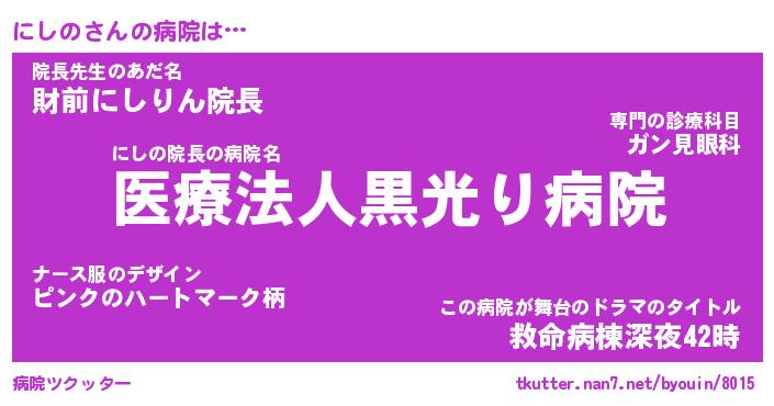 にしのさんの病院は… にしの院長の病院名『医療法人黒光り病院』院長先生のあだ名『財前にしりん院長』この病院が舞台のドラマのタイトル『救命病棟深夜42時』 ツクッター #病院ツクッター http://tkutter.nan7.net/byouin/8015/
