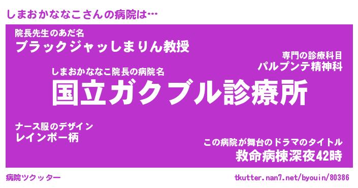 | 女子向けラノベタイトル風あだ名 | 『(仮)しまおかななこのやんごとなき事情』 |