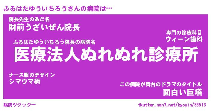 ふるはたゆういちろうさんの病院は… ふるはたゆういちろう院長の病院名『医療法人ぬれぬれ診療所』院長先生のあだ名『財前うざいぜん院長』この病院が舞台のドラマのタイトル『面白い巨塔』 ツクッター #病院ツクッター http://tkutter.nan7.net/byouin/83513/