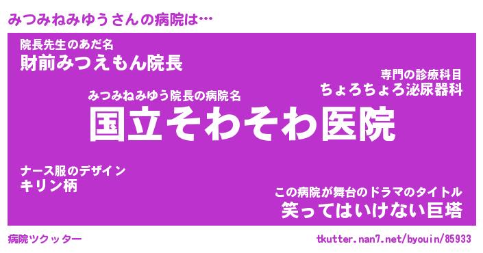 | 女子向けラノベタイトル風あだ名 | 『(仮)みつみねみゆうのやんごとなき事情』 |