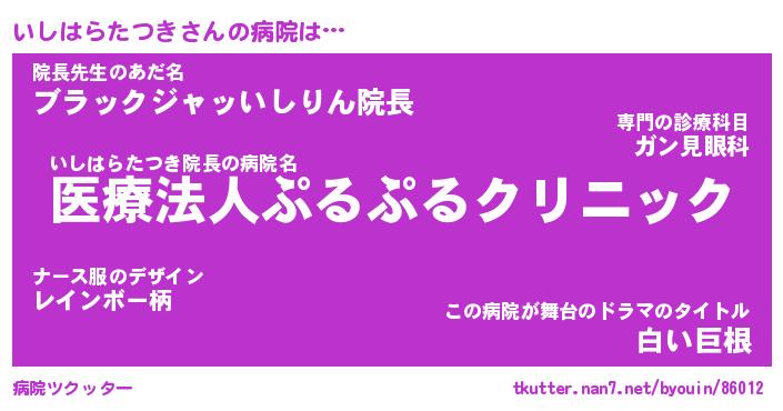 | 恥ずかしいあだ名 | 『プリティーいしはらたつき』『いしちん』 |