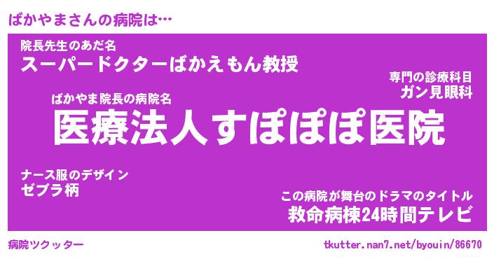 ばかやまさんの病院は… ばかやま院長の病院名『医療法人すぽぽぽ医院』院長先生のあだ名『スーパードクターばかえもん教授』この病院が舞台のドラマのタイトル『救命病棟24時間テレビ』 ツクッター #病院ツクッター http://tkutter.nan7.net/byouin/86670/