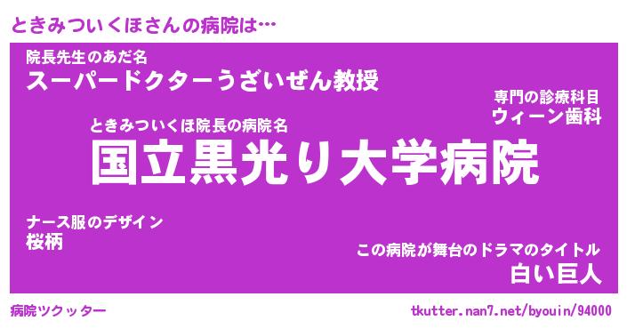 ときみついくほさんの病院は… ときみついくほ院長の病院名『国立黒光り大学病院』院長先生のあだ名『スーパードクターうざいぜん教授』この病院が舞台のドラマのタイトル『白い巨人』 ツクッター #病院ツクッター http://tkutter.nan7.net/byouin/94000/