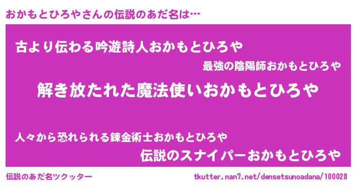 | 男性向けラノベタイトル風あだ名 | 『ダンジョンにおかもとひろやを求めるのは間違っているだろうか』 |
