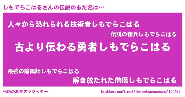 | ヘコむあだ名 | 『しもでらこはる(震え声)』『しもを』 |