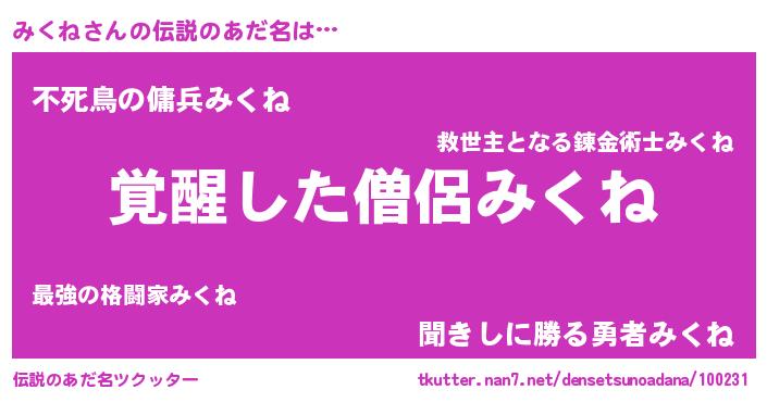 | 男性向けラノベタイトル風あだ名 | 『みくねの嫁は女の子じゃないと思った?』 |