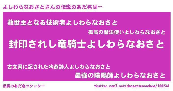 | 男性向けラノベタイトル風あだ名 | 『ヨシワラナオサトアートオンライン』 |