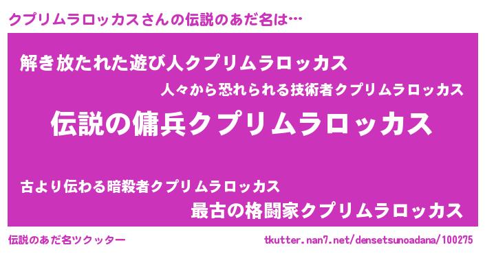 | 男性向けラノベタイトル風あだ名 | 『クプリムラロッカススレイヤー』 |