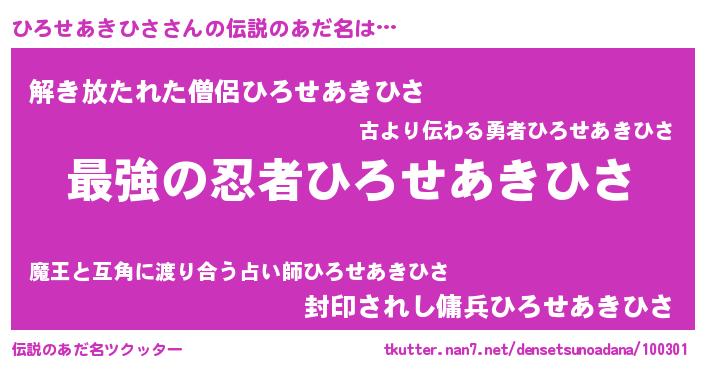 | 男性向けラノベタイトル風あだ名 | 『ひろせあきひさに滅ぼされるだけの簡単なお仕事です』 |