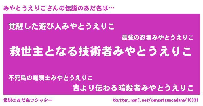 | 男性向けラノベタイトル風あだ名 | 『Re:みやとうえりこから始める異世界生活』 |