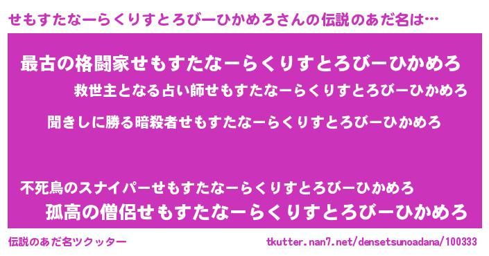| 男性向けラノベタイトル風あだ名 | 『セモスタナーラクリストロビーヒカメロスレイヤー』 |