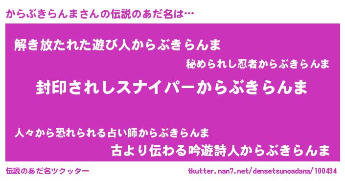 | 胡散臭い通販商品みたいなあだ名 | 『億万長者になれる霊験あらたかなお札…その名も「からぶきらんま」』 |