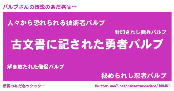 | 胡散臭い通販商品みたいなあだ名 | 『あなたにだけ特別に提供する世界で10本だけ現存している希少なブランデー…その名も「バルブ」』 |