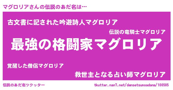 | 男性向けラノベタイトル風あだ名 | 『うちの娘の為ならば、俺はもしかしたらマグロリアも倒せるかもしれない。』 |