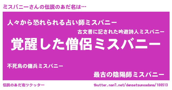 | ヒーロー風カッコイイあだ名 | 『炎刃騎士ミス』『愛の使者ミスバニー』 |