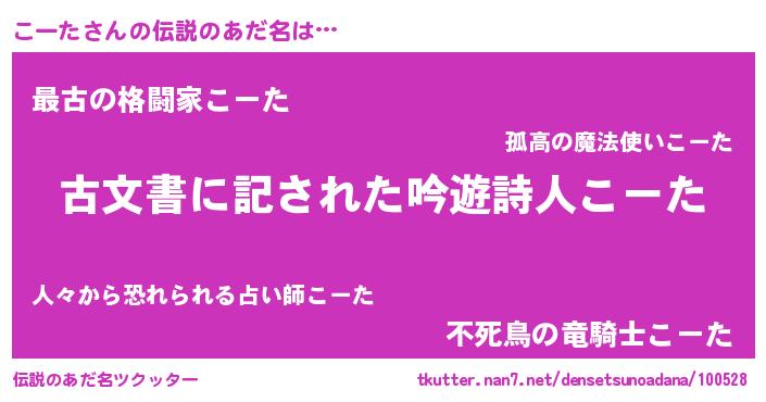 | 意味不明あだ名 | 『つくし科こーた属』『永久保存こーた』 |